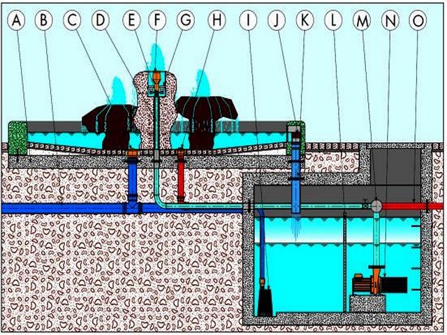 A: Fontána B: Přepad – odtokové potrubí C: Dnová vpust s uzávěrem D: Přívodní potrubí E: Sekundární zdroj vody F: Tryska fontány G: Podvodní světla H: Kabelová průchodka I: Kalové čerpadlo J: Zpětná armatura K: Zpětné potrubí L: Zachycovač nečistot M: Rozdělovač vody N: Čerpadlo O: Napájení